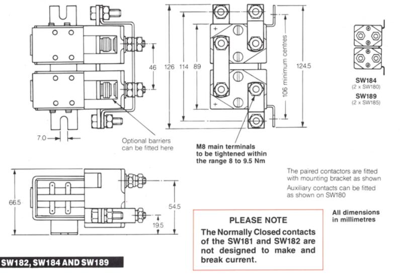 SW182采用双合金主触头,银合金尖端,耐焊接,耐磨,导电性能优异。主触点上的镀银是SW182的标准配置,但是可选择将其排除在规格之外。SW182是一款紧凑型接触器,可垂直或水平安装母线,如果垂直安装,则线圈应位于底部。如果顶部需要线圈,我们可以调整接触器以补偿这一点。