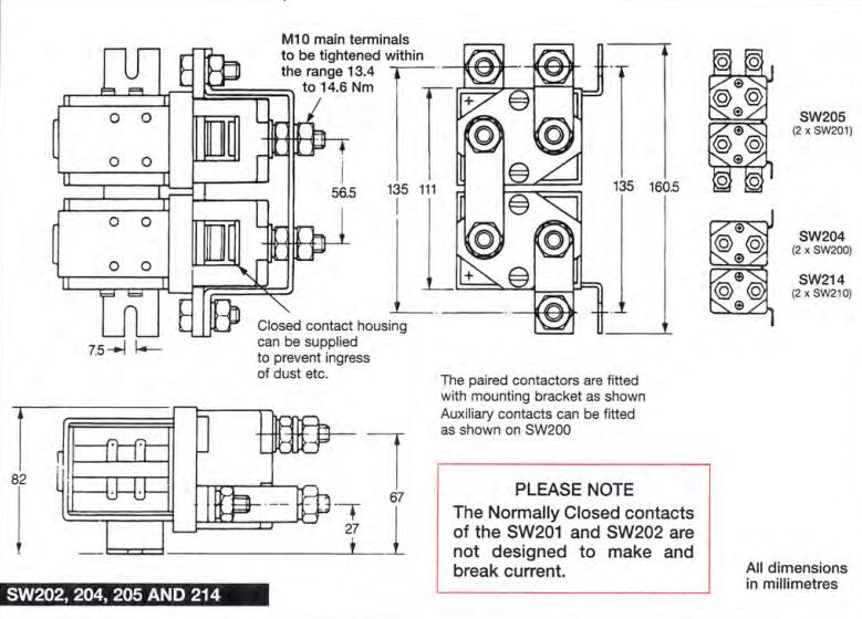 主触点电路设计用于电机反转,具有内置故障保护功能,因此如果两个线圈同时通电,则触点装置是开路的。SW202采用单刀双掷,双断合主触头,银合金尖端,耐焊接,耐磨,导电性能优良。SW202具有M10螺柱主端子和6.3mm铲形线圈连接。它可以通过M5螺纹孔或安装支架安装 - 可以提供安装,也可以作为单独的项目安装。安装可以是水平或垂直,垂直时M10接触螺柱应朝上。如果要求是向下定向,我们可以调整接触器以补偿这一点。