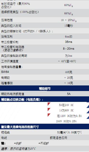 SW64是一款微型系列单极接触器 - - 无需站立,结构紧凑,旨在填补 30 安培继电器和 100 安培接触器之间的空隙。 设计用于中断和不间断负载, SW64适用于开关电阻,电容和电感负载。 典型应用包括开关小型牵引电机,液压动力单元和小型电动绞盘电机。