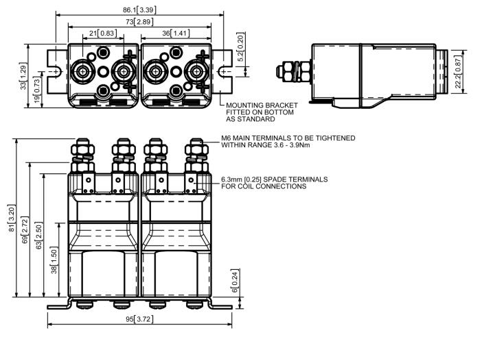 SW64P具有单刀双断主触点和银合金尖端,这些尖端具有耐焊接性,耐磨损性和优异的导电性。 SW64P具有M6螺柱主端子和6.3mm的黑色线圈连接。 它可以通过M4螺纹孔或安装支架进行安装 - 可以是随机提供的,也可以是单独的物品。安装可以在接触器的侧面或基座上。
